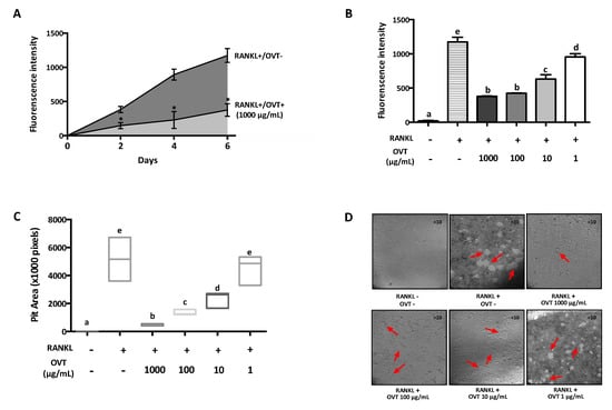 Effect of ovotransferrin on RANKL-induced bone resorption in vitro. RAW 264.7 was cultured onto fluoresceinated calcium phosphate (CaP)-coated plate and stimulated with RANKL (100 ng/mL) for 6 days. After 1 day for adhesion, cells were treated with ovotransferrin (1–1000 μg/mL) and RANKL together for 6 days. (A) The fluorescence intensity of resorbed CaP during 6-day treatment. * p < 0.05. (B) The total resorbed CaP after 6 days. (C) The total area of resorption pits after 6 days. (D) Image of resorption area. All images were captured under 10× magnification. The results are expressed as means ± SEM representative of 4 independent experiments. Means with different letters indicate p < 0.05.