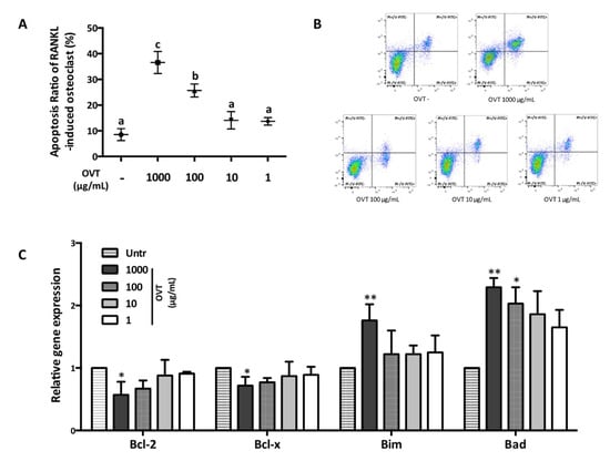 Effect of ovotransferrin on RANKL-induced osteoclasts apoptosis. Osteoclasts were generated by stimulating RAW 264.7 with RANKL (100 ng/mL) for 4–6 days and multinucleated cells were identified by microscopy. Then cells were treated with ovotransferrin (1–1000 μg/mL) for 12 h. (A) Osteoclasts apoptosis percentage. Means with different letters indicate p < 0.05. (B) Osteoclasts apoptosis measured by flow cytometry. The lower left quadrant: PI-/V-FITC-; upper left quadrant: PI+/V-FITC-; lower right quadrant: PI-/V-FITC+; upper right quadrant: PI+/V-FITC+. (C) The gene expression of the Bcl-2 family (Bcl-2, Bcl-xl, Bim, and Bid). The results are expressed as means ± SEM representative of 4 independent experiments. * p < 0.05; ** p < 0.01.