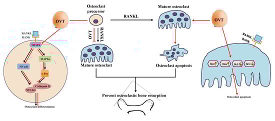 The mechanism of ovotransferrin attenuating RANKL-induced bone resorption. The mature osteoclast differentiates from its precursor and is responsible for bone resorption. OVT inhibits the activation of NF-κB and MAPK pathways during the differentiation, and then down-regulates several proteins (c-Fos, NFATc1, and cathepsin K) involved in osteoclastogenesis. OVT stimulates cell apoptosis in mature osteoclasts via regulating the expression of Bcl-2 family members. Based on this, OVT may have the ability to protect against bone loss.