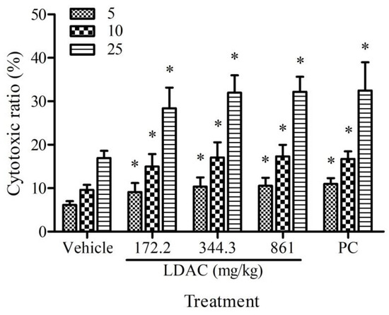 To evaluate the stimulatory effect of LDAC on NK cells, the cytotoxic activity of NK cells against YAC-1 cells was measured. The proportion of dead YAC-1 cells at an E/T ratio of 5:1, 10:1, and 25:1 was significantly higher among all treatment groups, compared to the vehicle control (Figure 1). The results suggest that LDAC exerts a dose-dependent effect on enhancing NK cell activity.
