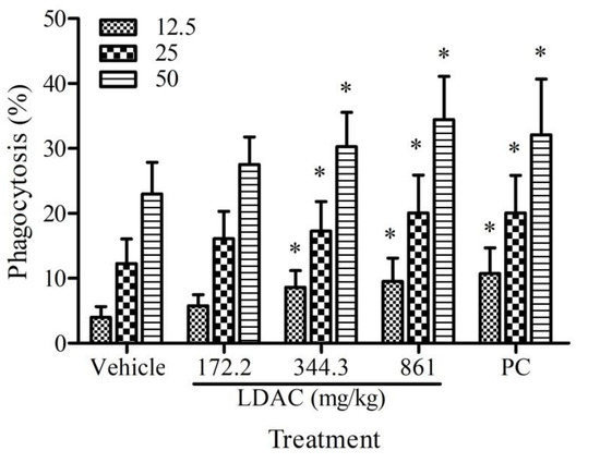 Effect of LDAC on phagocytic cell activity. The mice were administered with LDAC (172.2, 344.4, 861 mg/kg) and positive control (PC, 633.5 mg/kg) for 6 weeks. The peritoneal macrophages were isolated from mice and incubated with fluorescein-labeled E. coli at a multiplicity of infection (MOI) of 12.5–50. The ratio of phagocytosis was determined by flow cytometry. All data are presented as mean ± SD. * p < 0.05 compared to vehicle control.