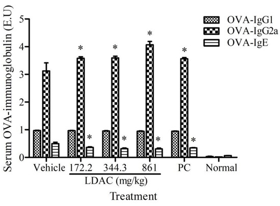 Effect of LDAC on serum ovalbumin (OVA)-IgG1, OVA-IgG2a, and OVA-IgE secretion. The OVA-immunized mice were administered with LDAC (172.2, 344.4, 861 mg/kg) and positive control (PC, 633.5 mg/kg) for 8 weeks. The serum OVA-IgG, OVA-IgG2a, and OVA-IgE were analyzed using ELISA assays. All data were presented as mean ± SD. * p < 0.05 compared to vehicle control. Normal group received only sterile water.