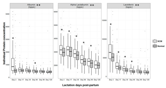 - Auldist, M.J.; Coats, S.; Rogers, G.L.; McDowell, G.H. Changes in the Composition of Milk From Healthy and Mastitic Dairy-Cows During the Lactation Cycle. Aust. J. Exp. Agric. 1995, 35, 427–436. [Google Scholar] [CrossRef]