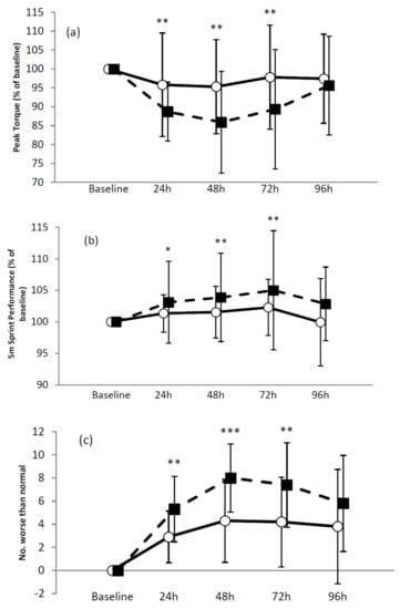 Surprisingly, STG2 had little impact on measures of muscle function, soreness, tiredness or perceptions of stress. Differences from 48–72 h and 48–96 h were typically trivial or unclear with some measures (peak torque, CMJ, RSI, soreness, tiredness, DALDA) continuing to return towards baseline values despite the demands of STG2, the exception being sprint performance. Nonetheless, performance of all muscle function variables remained below baseline at 96 h, which has implications for coaches and athletes in terms of training programmes and competition fixtures. The two-fold increase in the pattern of CK was as expected, with an increase observed following STG1, returning towards baseline before a second increase following STG2. This is similar to the pattern observed following repeated match play [3,8], though this pattern is clearly not aligned to that of muscle function. The other serum markers were either not impacted by STG2 (PCs) or not impacted across both groups (LOOHs, hsCRP), reflecting variability in the measures.