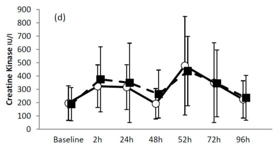 Baseline CK values were 196.2 ± 130.0 and 188.6 ± 125.0 U/L for MILK and CHO respectively. Unclear outcomes were found all timepoints. See Figure 1d. Baseline hsCRP values were 1.6 ± 2.0 mg/L and 1.1 ± 0.6 mg/L for MILK and CHO. A harmful effect was observed for MILK versus CHO at B-2h (1.1 ×/÷ 1.6 vs. 0.9 ×/÷ 1.6), B-24 h (1.5 ×/÷ 1.8 vs. 0.9 ×/÷ 1.8) and B-48 h (1.2 ×/÷ 2.0 vs. 0.7 ×/÷ 1.9). Comparisons at B-72 h and B–96 h were unclear. Baseline LOOH values were 0.6 ± 0.2 μmol/L and 0.6 ± 0.2 μmol/L for MILK and CHO. An unclear outcome was observed at B-2h. A harmful effect was observed for MILK at B-24 h (1.0 ×/÷ 1.2 vs. 0.9 ×/÷ 1.2), with unclear outcomes at all other times. Baseline PC values were 0.34 ± 0.33 nmol/mg protein and 0.27 ± 0.06 nmol/mg protein for MILK and CHO. Unclear outcomes were found at all timepoints.