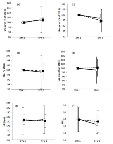 Mean values for simulated team game (STG) 1 vs. STG 2 (a) 5 m sprint performance; (b) 15 m sprint performance; (c) countermovement jump performance; (d) lap time; (e) heart rate; (f) rate of perceived exertion. Values are presented as the mean ± SD. ◯ MILK; ⬛ CHO.