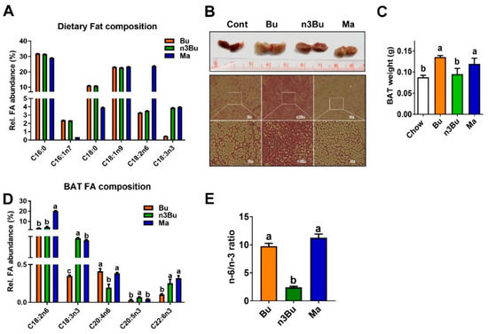 Supplementation with α-linolenic acid (ALA)-biofortified butter decreased triglyceride accumulation and n-6/n-3 polyunsaturated fatty acids (PUFA) ratio in the brown adipose tissue (BAT). (A) Fatty acid composition of the isocaloric high-fat (HF) diets made of conventional butter (Bu), ALA-biofortified butter (n3Bu), and margarine (Ma). (B) Gross image (upper) and histology of BAT (lower) after 10 weeks of HF diet feeding (representative of n = 8/group). (C) BAT weight. (D) Fatty acid profile in the BAT after supplementation. (E) n-6/n-3 PUFA ratio in the BAT. All data represented as mean ± SEM. Treatments with different letters are significantly different from one another (p < 0.05) by one-way ANOVA with Tukey’s multiple comparison tests.
