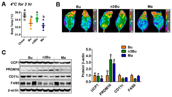 Next, we asked whether the dietary reduction of the n-6/n-3 FA ratio in ALA-biofortified butter alters BAT thermogenic activity. When mice were placed to a cold temperature (4 °C) acutely (3 h), n3Bu-fed mice were able to maintain a higher core-body temperature than Bu- or Ma-fed mice, as comparable to chow-fed mice (Figure 2A). The heat release, captured by IR camera, was higher in n3Bu-fed mice than Bu- or Ma-fed mice (Figure 2B). The qPCR analysis of brown-specific gene expressions revealed that Ma feeding substantially decreased the brown signature gene expressions of Ucp1, Prdm16, Pgc1α, Cidea, and Dio2, while n3Bu showed a tendency to increase these gene expressions compared to the Bu control (Figure S1). Consistently, the protein expression levels of uncoupling protein 1 (UCP1) were reduced in Ma-fed mice compared to Bu or n3Bu. The expression levels of PRDM16, a key transcription factor for brown adipogenesis, were higher in n3Bu-fed BAT than Bu- or Ma-fed BAT. Importantly, BAT from n3Bu feeding showed a remarkable decrease in F4/80 and CD11c expression levels, implying that the n3Bu suppresses macrophage infiltration and proinflammatory M1 polarization compared to the Bu- or Ma-fed group (Figure 2C).
