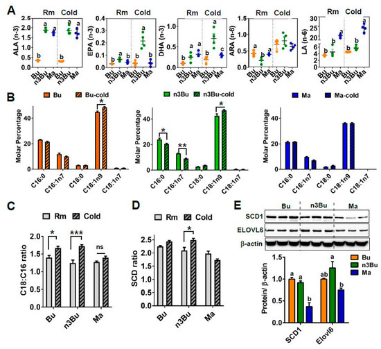 Emerging evidence suggests that the thermogenic activation of BAT is associated with FA remodeling, including augmented n-3 LC PUFA synthesis and FA elongation [22]. Based on this literature suggestion, we next investigated the impact of n3Bu on lipid metabolism in the BAT during thermogenic activation. The GC/MS analysis revealed that cold treatment (CT, 4 °C) for 48 h resulted in a rapid increase in EPA and DHA in the BAT in response to n3Bu feeding compared to mice kept at an ambient temperature (RT, 22 °C) (Figure 3A). However, these changes in n-3 LC PUFA were less prominent in the BAT with Bu feeding and almost completely absent with Ma feeding (Figure 3A). We also examined the differential impact of Bu, n3Bu, and Ma feeding on FA elongation and desaturation. Cold treatment decreased the content of C16 FA (palmitic and palmitoleic acid) but increased the C18 FA (stearic acid) content in n3Bu-fed BAT and, to a lesser degree, Bu-fed BAT. However, Ma-fed BAT failed to alter the FA elongation in response to cold temperatures (Figure 3B). Therefore, the FA elongation ratio (see the formula in the method section) in the BAT was most evident with n3Bu feeding (Figure 3C). Also, the degree of FA desaturation was higher in n3Bu-fed BAT than in Bu- or Ma-fed BAT upon cold treatment (Figure 3D). The reductions in SCD-1 and ELOVL6 expression in Ma-fed BAT were significant (Figure 3E), although the difference between n3Bu- and Bu-fed BAT did not reach statistical significance. Consistently, there was an increase in the transcription levels of Scd-1, Elovl6, and Elvol3 in the n3Bu-fed BAT compared to Bu, but a substantial decrease in these genes in Ma-fed BAT (Figure S2). However, the changes in the delta-5 and delta-6 desaturase levels were similar between the groups (Figure S2). Collectively, these results suggest that ALA-biofortified butter facilitates the cold-mediated n-3 LC PUFA synthesis and FA elongation/desaturation.