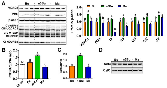 Molecular events for thermogenic activation include mitochondrial biogenesis in the BAT [23]. Next, we investigated whether the improved thermogenic function by n3Bu feeding is linked with mitochondrial biogenesis. There was a substantial increase in mitochondrial proteins in the n3Bu-fed BAT compared to Bu- or Ma-fed BAT, including (1) voltage-dependent anion channel 1 (VDAC1) located in the mitochondrial outer membrane, (2) pyruvate dehydrogenase (PDH) located in the mitochondrial matrix, and (3) oxidative phosphorylation proteins (OxPhos) located in the mitochondrial inner membranes (Figure 4A). Conforming to the increased mitochondrial mass, the mitochondrial DNA to genomic DNA ratio (mtDNA/gDNA) was significantly higher in n3Bu-fed BAT compared to Bu- or Ma-fed BAT (Figure 4B).