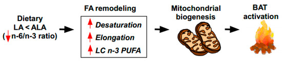 Working model of dietary ALA enrichment on thermogenic activation in the BAT. The reduced n-6/n-3 ratio by dietary supplementation with ALA enriched foods induces fatty acid remodeling, including the augmentation of desaturation, elongation, and long-chain (LC) n-3 PUFA formation. These FA profile changes facilitate mitochondrial biogenesis, leading to the thermogenic activation of the BAT.