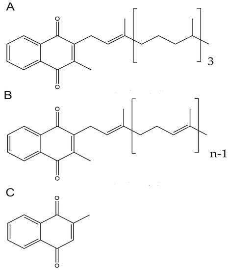 Chemical Structure of Vitamin K vitamers. Phylloquinone or vitamin K1 (A), menaquinone-n (MKn), or vitamin K2 (B) and menadione or vitamin K3 (C).