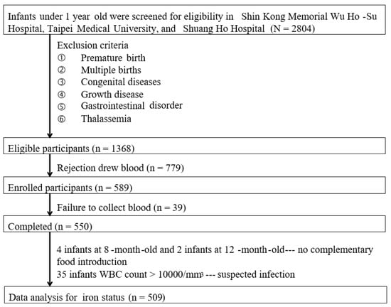 A total of 1368 infants were eligible for this study. However, 779 mothers did not provide consent to extract their infants’ blood, and therefore, the 589 subjects were ultimately enrolled in this study. However, blood draws were unsuccessful in 39 infants. Thus, a total of 550 cases were included for data analysis. Because no introduction of complementary food to infants over six months of age was considered as abnormal feeding, four infants aged eight months and two aged 12 months were excluded accordingly. In addition, 35 infants with a WBC count of >0.000/mm3, suspected of infection, were excluded. Data on the iron status analysis of 509 infants are presented in Figure 1.