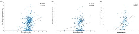 Iron is essential for hematopoiesis. We observed that the total dietary iron intake was positively correlated with Hb (r = 0.292, p < 0.001) (Figure 2A). We further divided the data into the following two subgroups: One to six months (Figure 2B) and 7–12 months (Figure 2C). The data revealed that the correlation between total dietary iron intake and Hb in infants aged 7–12 months was higher than in those aged 1–6 months (r = 0.390, p < 0.001 vs. r = 0.130, p = 0.028).
