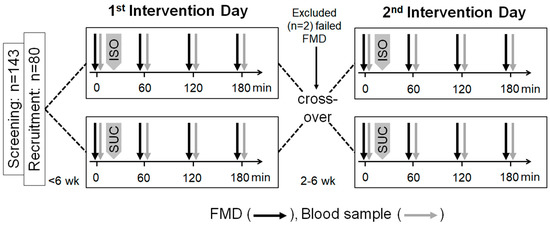 Outline of the study protocol. FMD, flow-mediated dilation; ISO, citrus drink containing 50 g of isomaltulose; SUC, citrus drink containing 50 g of sucrose.