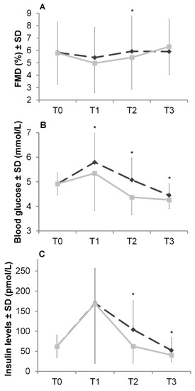 Independent of the carbohydrate, a correlation analysis between FMD and blood glucose levels at different time points showed a trend for a negative association at T0 and T2 (r-range = −0.202 to −0.230, p < 0.1; data not shown). With respect to insulin response, no associations with baseline or postprandial FMD were observed.