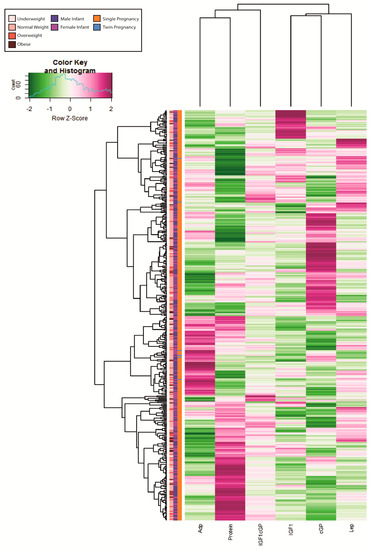 Time of HM collection (i.e., month post-partum) in the present cohort (for leptin β = −0.030 and p = 0.505, for adiponectin β = −0.019 and p = 0.667, for IGF-1 β = 0.059 and p = 0.191, for cGP β = 0.033 and p = 0.498) did not affect any of the analytes, and thus, was not included in any further analyses. Values of the five analytes across the study population are reported in Table 2. IGF-1 and adiponectin concentrations displayed correlations with leptin (β = 0.189 for IGF-1 and β = 0.089 for adiponectin). A visualization of the general hormonal composition and clustering is shown in Figure 1.