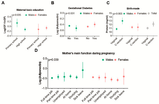 Our cohort presented evidence of sex-specific effects on HM hormonal concentrations. IGF-1/cGP ratio showed a sex-specific interaction with maternal basic education (p = 0.035, Figure 2A). Additionally, adiponectin concentrations were observed to be different for male and female infants in relation to GDM (p = 0.031, Figure 2B) and maternal work status during pregnancy (p = 0.039, Figure 2D). However, in the case of GDM, the sex-specific differences became non-significant when correcting the analysis for exclusive duration of breastfeeding (p = 0.05). Finally, total protein concentrations were elevated in mothers of males who underwent C-section (Figure 2C).