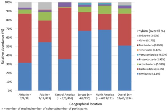 Relative abundance data were individually weighted according to the sample size of the relevant cohort. Results in tables and figures represent these values. To reduce variance, observations with a weighted average relative abundance of less than 0.05% at phylum rank, 0.5% at family rank, and 0.5% at genus rank were separately grouped into ‘Other’ at their taxonomic rank. Only baseline microbiome data are presented. At the phylum rank, test of the differences in relative abundance between groups (geographic location, age, and 16S region) were conducted in SPSS Version 25, using the Kruskal–Wallis test [48], and Bonferroni correction [49] was applied to minimize Type I error. Significance level was set at 0.05. Firmicutes: Bacteroidetes ratios were calculated using raw abundance data.