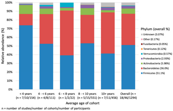 Age was not associated with changes in community structure, although there were trends in specific taxa. Actinobacteria generally decreased with age and Proteobacteria increased. Bifidobacterium, a dominant genus that sits within Actinobacteria, gave a similar trend, decreasing with age. Bifidobacteria is one of the early colonizers of the newborn microbiome and is involved in the breakdown of non-digestible carbohydrates [98]. It has been shown to be associated with several positive health outcomes [99], including the prevention or treatment of cancer in animal models [100,101] and the reduction of diarrhea episodes in infants [102,103]. Despite the quantity of research in the area, the researchers identified no obvious reason for the decrease in relative proportions of Bifidobacteria from early childhood into puberty and may be inversely related to proliferation of other bacteria, such as Proteobacteria. This phylum contains some of the most well know pathogens, including the genera Escherichia, Salmonella, Vibrio, and Helicobacter [104] and bacteria that may or may not be beneficial such as Sutterella [105,106]. As noted by Derrien et al. [45], there is a paucity of research in pre-school (3–6 years) and primary age (6–12 years) children. However, the results from this review are in line with other research that suggests there are limited changes in α- and β-diversity after the early years of life and the microbiome typically resembles an adult-like composition [14,45,107].