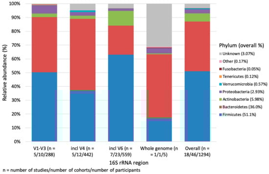 How the microbial composition is detected, metagenomics or 16S rRNA amplicon, also impacts the outcome. Of the 1294 participants (18 studies) that had phylum rank data, less than 1% had whole genome data available (Table S3, Figure 3). Seven of the 18 studies sequenced regions that included the V6 region whereas V4 and V1-3 was represented by five studies each. V6 region studies had significantly higher proportions of Firmicutes and Actinobacteria than those who sequenced the V4 region (p = 0.004 and p = 0.001, respectively). V1-V3 region studies had significantly higher proportions of Proteobacteria than V4 and V6 region studies region (p < 0.001 and p = 0.007, respectively). α-diversity was not significantly different (p = 0.355) by region. Whereas, β-diversity analysis indicated that V6 region studies were significantly different to V1-V3 region studies (p = 0.009), V4 region (p = 0.007) and whole genome data (p = 0.043). Whole genome was also significantly different to the other two variable regions (V4 region p (Monte Carlo) = 0.041 and V6 region p (Monte Carlo) = 0.016).