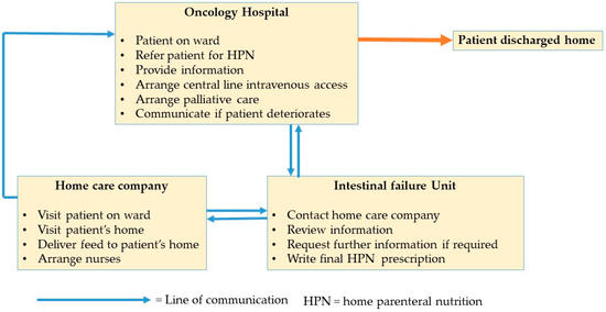 Patients were started on parenteral nutrition at a specialised oncology hospital. HPN discharge was overseen remotely by a specialist intestinal failure unit (IFU) situated in another hospital (Figure 1). All discharge arrangements for HPN followed a remote discharge pathway agreed between the two hospitals and developed over a number of years [11]. The IFU contracted a homecare company to supply equipment and feed to the patient at home. The homecare company also employed nurses to administer feed.