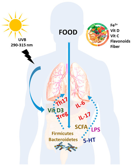 Impact of nutrition in PAH. Dietary components such as Fe2+, vitamins C and D, flavonoids and other related polyphenols, and fiber as well as vitamin D obtained from the exposure to sunlight may have a positive impact the quality of life and prognosis of PAH patients. Each dietary factor may have its own mechanism of action. However, part of the effects of these nutrients may be related to their effect on the immune system with restoration of T cells and cytokines, changes in the microbiota and their bacterial products, and bacterial translocation.