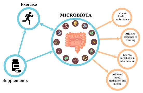 In this review, we analyze the effects of mutual interactions between exercise, sport dietary supplements, and microbiota on the overall general health and performance of athletes.