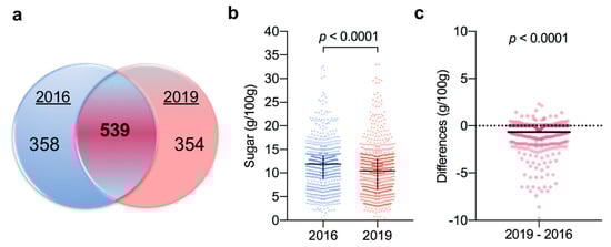 Comparison of total sugar content in yogurt products sold in 2016 and 2019. (a) Analysis of product names and brands identifies 539 products sold in both years. (b) Distribution of sugar content of all products from 2016 (n = 898) and 2019 (n = 893). Data were analysed using the Mann–Whitney test; black cross indicates median and interquartile range. (c) Difference plot of the change in sugar content between the products sold both in 2019 and 2016 (n = 539). Data were analysed using the Wilcoxon matched-pairs signed-rank test; solid black line indicates mean change (−0.6113) between 2016 and 2019.