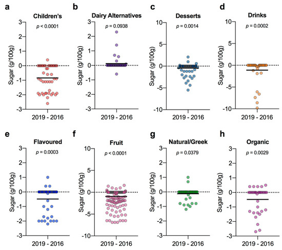 Difference plots for each category showing the change in total sugar content between yogurt products sold both in 2019 and 2016. (a) Children’s (n = 46); (b) dairy alternatives (n = 39); (c) desserts (n = 77); (d) drinks (n = 40); (e) flavoured (n = 60); (f) fruit (n = 195); (g) natural/Greek (n = 47); (h) organic (n = 35). Data were analysed using the Wilcoxon matched-pairs signed-rank test; solid black line indicates mean change between 2016 and 2019.