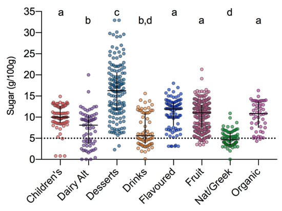 Total sugar content of UK yogurt products across categories. Black cross indicates median and interquartile range. Data were tested for normality and analysed using the Kruskal–Wallis and Dunn’s multiple comparison tests; categories not assigned the same lettering (a–d) are significantly different. Dashed line indicates threshold defined by European Union (EU) regulations for low-sugar nutrition claim [17].