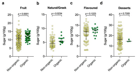 Lastly, in the previous survey, the organic category was found to have perhaps surprisingly high sugar contents in comparison to all other categories other than desserts. In recognising the underlying heterogeneity of this category (where products are placed based on a label related to food production). We chose to further examine the sugar contents of the underlying sub-categories in comparison to their corresponding non-organic group. Interesting, in spite of much fewer products in the organic category, nonetheless both organic fruit (Figure 4a) and organic natural/Greek (Figure 4b) yogurts were found to have higher median sugar contents than their non-organic counterparts (p = 0.0001 and p = 0.024, respectively). On the other hand, no differences in median sugar levels were observed for the flavoured (p = 0.1223; Figure 4c) and dessert (p = 0.7305; Figure 4d) categories. Although notably the number of organic dessert products was very small (n = 3 vs. 150).