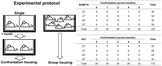 Experimental protocol describing the housing condition. For confrontational housing, a standard polycarbonate cage was divided into two identical subunits by a stainless steel partition. Two mice were housed in the partitioned cage for one month (single housing). These mice were further divided into two groups that ingested theanine or control water. Then, the partition was removed, and subsequently the two mice cohabited the same cage (confrontational housing). Group-housing mice were housed in groups of six. Mice that ingested theanine under confrontational housing, CT; mice that ingested control water under confrontational housing, CC; mice that ingested theanine under group housing, GT; mice that ingested control water under group housing, GC. Confrontation periods were 0, 1, 2, 4 and 6 months. The number of mice for each group is shown.