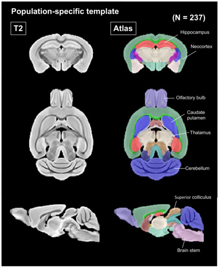 - Pagani, M.; Damiano, M.; Galbusera, A.; Tsaftaris, S.A.; Gozzi, A. Semi-automated registration-based anatomical labelling, voxel based morphometry and cortical thickness mapping of the mouse brain. J. Neurosci. Methods 2016, 267, 62–73. [Google Scholar] [CrossRef] [PubMed]