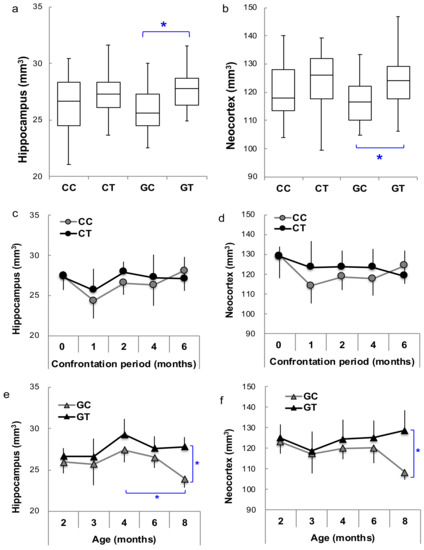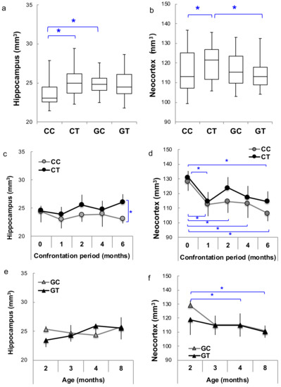 The brain volumes of ddY mice. Boxplot of the volumes of brain sections in the hippocampus (a) and neocortex (b) were compared among the four groups (CC, CT, GC and GT) without distinguishing age (n = 115, *; p < 0.05). The time-course of the hippocampus and neocortex were compared between CC and CT (c,d) and between GC and GT (e,f) (n = 4–6; *, p < 0.05).