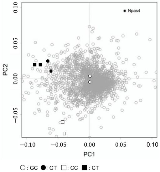 Principal component analysis of gene expression. Hippocampal samples were obtained from mice housed confrontationally for three days. Group-housed mice were kept in a cage for one month. The principal component (PC) ordination of ANOVA-positive genes us based on the transcriptome of hippocampal gene expression in mice of GC (open circle), GT (closed circle), CC (open square) and CT (closed square) groups (n = 2 for each group). Each small dot represents the expression of each gene. Neuronal Per-Arnt-Sim (PAS) domain protein 4 (Npas4) is shown as a small black circle.