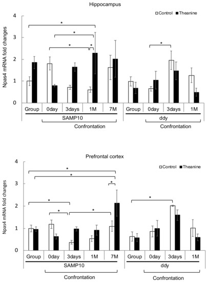 Expression levels of Npas4 mRNA in the hippocampus and prefrontal cortex of SAMP10 and ddY mice. Mice consumed theanine (20 µg/mL water, closed bar) or normal tap water (control, open bar) ad libitum. After single housing for one month, hippocampal and prefrontal cortex samples were obtained from mice housed confrontationally for 0 days, 3 days, 1 month, and 7 months. Group-housed mice were kept in a cage for two months. Values are expressed as means ± SEM (n = 3–6, * p < 0.05).