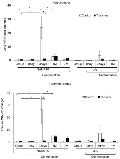 Expression levels of Lcn2 mRNA in the hippocampus and prefrontal cortex of SAMP10 and ddY mice. Mice consumed theanine (20 µg/mL water, closed bar) or normal tap water (control, open bar) ad libitum. After single housing for one month, hippocampal and prefrontal cortex samples were obtained from mice housed confrontationally for 0 days, 3 days, 1 month, and 7 months. Group-housed mice were kept in a cage for two months. Values are expressed as means ± SEM (n = 3–6, * p < 0.05).