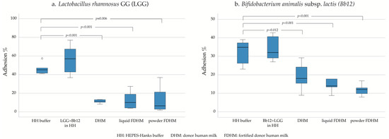 In general, the best adhesion of LGG was achieved when it was suspended in buffer rather than when milk was present. Recently, it was reported that donor human milk can be safely stored up to 8 months after Holder pasteurization, without compromising its macronutrient and energy content [34]. One component of DHM that might contribute to this finding is human milk macrophages, the survival of which is decreased to a small extent by pasteurization temperature [35,36,37]. Indeed, a recent study found that the SpaCBA pili of LGG are key molecules for adhering to macrophages [38]. Similarly, analysis of the extracellular proteome of Bb12 revealed that two identified proteins are involved in the binding of manganese, an essential trace element that is also present in human milk [21]. Although pasteurization has a negative impact on the concentration/activity of some bioactive constituents of human milk, it does not affect the content of human milk oligosaccharides (HMO) [39]. Growth in the presence of a combination of human milk oligosaccharides (3′sialyllactose and 6′sialyllactose) was shown to substantially increase the adhesion of Bifidobacterium longum subsp. infantis to epithelial cells. However, in contrast to this bacterium, neither LGG or Bb12 are able to grow in the presence of HMOs [40]. On the other hand, these compounds are structurally very similar to mucus glycoproteins as they are both recognized by the same outer-membrane enzyme systems [41]. In addition, LGG, contrary to Bb12, has been shown to ferment L-fucose, which is a major constituent of both mucus and HMOs [40,42,43]. HMOs could, therefore, act as decoy receptors for probiotics, interfering with their adhesion to the mucus layer.
