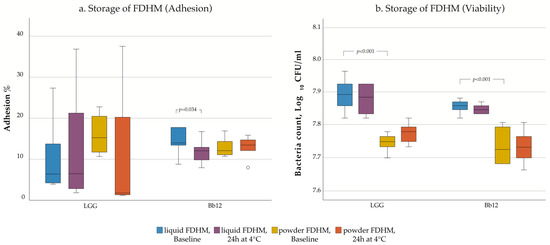 Finally, storage did not significantly affect probiotic adhesion to intestinal mucus (Figure 3a). Interestingly, only Bb12 in liquid FDHM saw a notable decline in its adhesion capacity after storage for 24 h at 4 °C (Baseline: 14.3%, Storage: 11.9%; p = 0.034). When assessed by the traditional culturing method, the viability of LGG and Bb12 was maintained even after 24 h at 4 °C as there were no statistically significant decreases in the number of viable cells of the probiotic preparations (p > 0.05, Figure 3b). However, there was a significant difference in the CFU/mL of both bacteria between liquid and powder FDHM (LGG: 7.9 log10 CFU/mL (liquid FDHM), 7.7 log10 CFU/mL (powder FDHM), p < 0.001; Bb12: 7.8 log10 CFU/mL (liquid FDHM), 7.7 log10 CFU/mL (powder FDHM), p < 0.001).