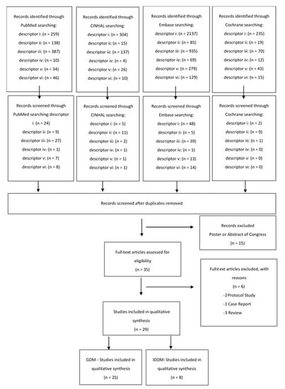 The selected literature studies were focused specifically on one of two types of diabetes: GDM or IDDM. In line with this finding, we evaluated the studies separately, based on the diabetes type. Since type 2 diabetes was only referenced in a single article and compared to GDM, it is not discussed separately in our review.
