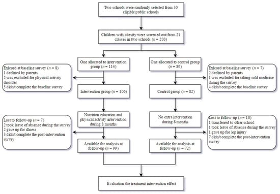 A school-based nutrition education and physical activity was conducted from November 2015 to June 2016 in Wuhan, China. The study was approved by the Medical Research Ethics Committee of Wuhan University and was registered with ClinicalTrials.gov (ID: NCT02773823). Written informed consent was obtained from parents of the children. Two primary schools with a similar scale of size were selected from Xinzhou District, Wuhan. The schools were randomly allocated to the intervention group (IG) or control group (CG).