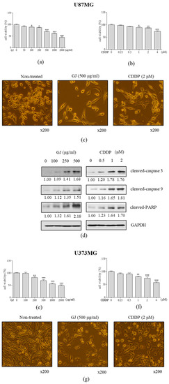 Effect of GJ and CDDP on cell viability of U87MG and U373MG cells. MTT assays were performed in (a) GJ-treated and (b) CDDP-treated U87MG cells. (c) Microscopical observation of cell morphology was performed in GJ- and CDDP-treated U87MG cells. (d) Western blot assays on cleaved caspase-3, cleaved caspase-9, and cleaved poly (ADP-ribose) polymerase (PARP) were performed in GJ- and CDDP-treated U87MG cells. MTT assays were performed in (e) GJ-treated and (f) CDDP-treated U373MG cells. (g) Microscopical observation of cell morphology was performed in GJ- and CDDP-treated U373MG cells. Results are displayed as mean ± S.E. of three or more separate experiments. Glyceraldehyde-3-phosphate dehydrogenase (GAPDH) was used as endogenous control. * p < 0.05 vs. untreated cells, ** p < 0.01 vs. untreated cells, *** p < 0.005 vs. untreated cells. GJ, Gardenia jasminoides; CDDP, cisplatin.