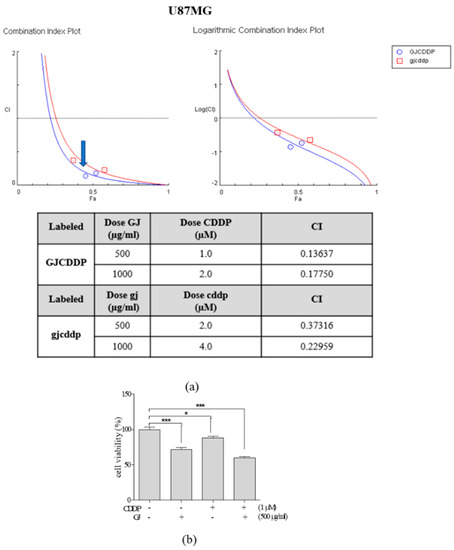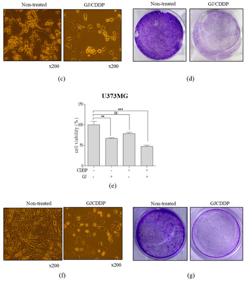 Based on the above results, we then assessed the synergistic effect of GJ and CDDP when their combination was treated in U87MG GBM cells. We established two different combination ratios (250:1 and 500:1 (µg/mL:µM)) of GJ:CDDP and calculated CI of the GJ/CDDP combination (Figure 2a). As CI of 500:1 was relatively lower than 250:1, we selected 500:1 as the combination ratio of GJ/CDDP for further experiments. As shown in Figure 2b, the combination of GJ and CDDP showed significant synergism in cell viability of U87MG cells. GJ/CDDP combination showed higher cytotoxicity compared to single treatments of either GJ or CDDP in U373MG cells as well (Figure 2e). On the other hand, GJ/CDDP combination showed less effect in cell death of normal astrocytes, suggesting the supplementation of GJ improved CDDP-induced cytotoxicity in astrocytes (Figure S2).