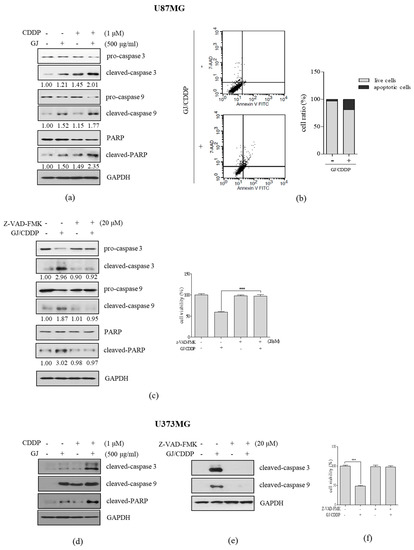 Next, to evaluate whether GJ/CDDP treatment induced apoptosis in GBM cells, we measured the protein expression of crucial apoptotic factors including cleaved-caspase 3, 9, and cleaved PARP. Compared to GJ (1.21-, 1.52-, 1.50-fold increase in cleaved-caspase 3, cleaved-caspase 9, and cleaved-PARP, respectively) and CDDP (1.45-, 1.15-, 1.49-fold increase in cleaved-caspase 3, cleaved-caspase 9, and cleaved-PARP, respectively), GJ/CDDP combination showed higher expressions in these factors of 2.01-, 1.77-, 2.35-fold increase in cleaved-caspase 3, cleaved-caspase 9, and cleaved-PARP, respectively (Figure 3a). In addition, assessing cell count after Annexin V staining by flow cytometry analysis showed increased apoptosis by GJ/CDDP treatment (Figure 3b). Further confirmation in MTT assays after Z-VAD-FMK treatment, a pan-caspase inhibitor, we found out that GJ/CDDP treatment cannot display cell toxicity in apoptosis-inhibited conditions (Figure 3c), suggesting that GJ/CDDP affects cell viability by increasing apoptosis of U87MG cells. Consistently, similar results were observed in U373MG cells (Figure 3d–f).