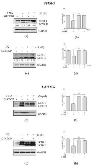 To verify the role of autophagy in GJ/CDDP-induced cell death, we pre-treated U87MG cells and U373MG cells with 3-MA, the early stage inhibitor of autophagy, and CQ, the late stage inhibitor of autophagy. When pre-treated with 3-MA, increase of LC3B-II by GJ/CDDP was inhibited (Figure 5a,e), and MTT assay showed decrease in cytotoxicity (Figure 5b,f) implying the blockage of autophagosome formation nullifies the effect of GJ/CDDP. Pre-treatment with CQ showed a massive 1.89-fold increase by GJ/CDDP treatment compared to untreated cells, indicating the accumulation of autophagosomes (Figure 5c). GJ/CDDP combination also increased LC3B-II accumulation in U373MG GBM cells (Figure 5g). Moreover, GJ/CDDP-induced decrease of cell viability in both U87MG and U373MG cells was not observed when CQ was pre-treated (Figure 5d,h). From the above results, we could conclude the autophagic flux is crucial in the cytotoxic action of GJ/CDDP.