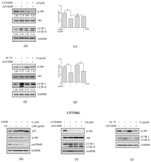 Effect of GJ/CDDP combination on AKT/mTOR pathway in U87MG and U373MG cells. Western blot assays on (a) p53, (b) p-AKT, and (c) p-p70S6K were performed in GJ/CDDP combination-treated U87MG cells. (d) Western blot assays on p-AKT and LC3B-I/II, and (e) an MTT assay were performed in GJ/CDDP combination-treated U87MG cells after pre-treatment with LY294002. (f) Western blot assays on p-AKT and LC3B-I/II, and (g) an MTT assay was performed in GJ/CDDP combination-treated U87MG cells after pre-treatment with SC79. (h) Western blot assays on p53, p-AKT, and p-p70S6K were performed in GJ/CDDP combination-treated U373MG cells. (i) Western blot assays on p-AKT and LC3B-I/II were performed in GJ/CDDP combination-treated U373MG cells after pre-treatment with LY294002. (j) Western blot assays on p-AKT and LC3B-I/II were performed in GJ/CDDP combination-treated U373MG cells after pre-treatment with SC79. Results are displayed as mean ± S.E. of three or more separate experiments. GAPDH was used as endogenous control. *** p < 0.005 vs. untreated cells. GJ, Gardenia jasminoides; CDDP, cisplatin.