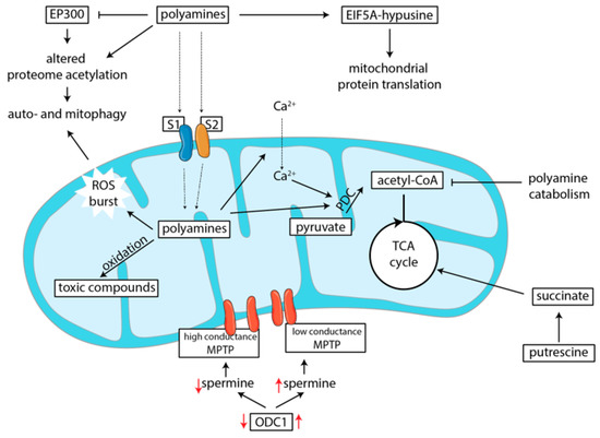 The role of polyamines in metabolism. Polyamines modify EIF5A by hypusination, which leads to upregulated of mitochondrial protein translation (Section 5.1). Polyamines can induce both auto- and mitophagy, through various mechanisms (Section 5.2). Firstly, through inhibition of the lysine acetyltransferase EP300, which leads to altered proteome acetylation and autophagy. Secondly, through induction of a ROS burst, which leads to activation of Ataxia-telangiectasia mutated (ATM) protein and more downstream induces mitophagy. Putrescine can, through conversion to succinate, serve as a direct energy source for small intestinal enterocytes (Section 5.3). However, polyamine catabolism can deplete acetyl-CoA levels, because it is used as a substrate by SSATs (Section 5.4). Polyamines are transported into mitochondria, where then influence respiration directly, through interaction with the pyruvate dehydrogenase complex (PDC), or indirectly by increasing Ca2+-concentrations, thereby increasing PDC activity (Section 5.5). At the same time, polyamine catabolism within the mitochondrial matrix leads to local production of toxic compounds, which may negatively affect respiratory functions (Section 5.6). But, polyamines can also protect mitochondrial membrane integrity through regulation of the mitochondrial permeability transition pore (Section 5.7). In red, regulation of spermine levels is indicated. When ODC1 is upregulated, more spermine is produces which induces the formation of the low conductance state of MPTP. This helps to maintain proper membrane integrity. When ODC1 activity is decreased, intracellular spermine concentrations are decreased, and the high conductance state of the MPTP cannot be prevented, resulting in mitochondrial swelling. EP300: E1A-binding protein p300; ROS: reactive oxygen species; MPTP: mitochondrial permeability transition pore; EIF5A: eukaryotic translation initiation factor 5A; TCA: tricarboxylic acid cycle; SSATs: spermidine/spermine N-1 acetyl transferases; S1 and S2: mitochondrial polyamine transporters 1 and 2.