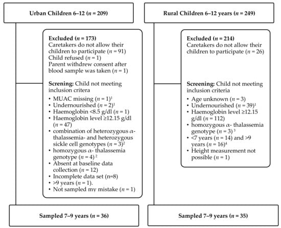Figure 1 shows the number of children who participated in the study in the format of a CONSORT diagram. After the screening, the age distribution of eligible children was centered to 7–9 years in the urban group while equally distributed in the rural group. In order to increase homogeneity of the target groups, age was restricted to 7–9 years in both groups for data analysis except for reported underweight and high hemoglobin levels at screening.