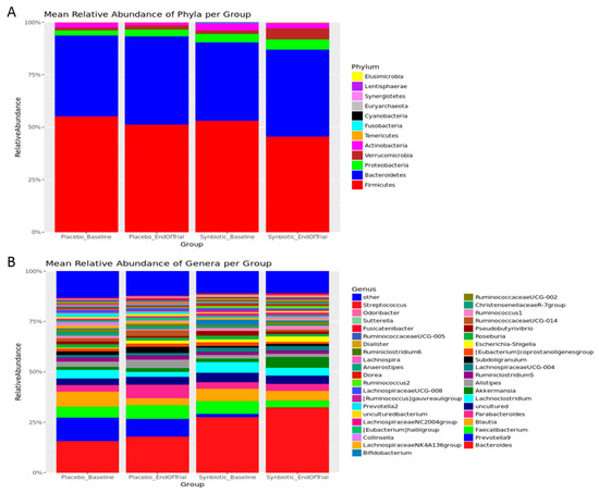 The data obtained confirm that Firmicutes and Bacteroidetes were the two most abundant bacterial phyla in the gut (see Figure 1A) and Bacteroides was the most abundant genus (see Figure 1B). The synbiotic supplementation induced statistically significant alterations in the composition of the gut microbiota at the end of trial, as compared with the placebo group (Figure 2). All data remained significant after adjusting for multiple testing (supplemental Table S5). At the phylum level, increases in relative abundance of Cyanobacteria, Euryarchaeota, Fusobacteria, and Lentisphaerae were observed following synbiotic intervention. At the genus level, relative abundance of Ruminococcus, Bifidobacterium, Sutterella, Tyzzerella, Eisenbergiella, Eubacterium, Eggerthella, Methanobrevibacter, Lachnospiraceae, Edwardsiella, Lactobacillus, Allobaculum, Enterococcus, Hydrogenoanaerobacterium, Coprococcus, and Butyricimonas were significantly higher. The relative abundance of Ruminococcaceae, Prevotella, Gardnerella, Turicibacter, and Megasphaera at the end of trial was significantly lower in the synbiotic group, as compared with the placebo group. These results indicate that the synbiotic supplement used in the study modified the relative abundance of gut bacteria, some of which can be associated with health benefits (particularly, significantly increased abundance of Bifidobacterium and Lactobacillus).